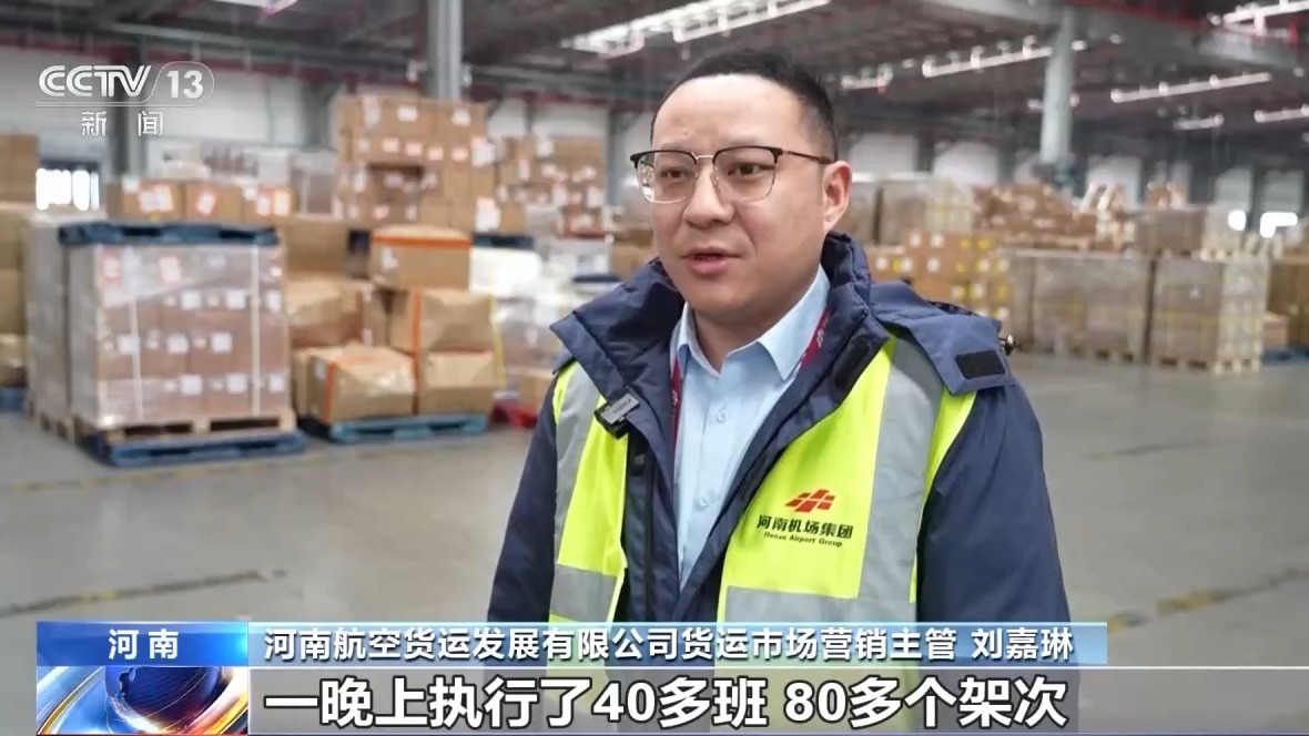 河南航空货运发展有限公司货运市场营销主管 刘嘉琳:最繁忙的时候,一晚上执行了40多班,80多个架次。每一个环节、每个时间节点我们都有监控,哪个节点出现问题了,耽搁的时间比较长了,后台对现场进行提醒。高峰期加派人员,大大提高了作业效率。