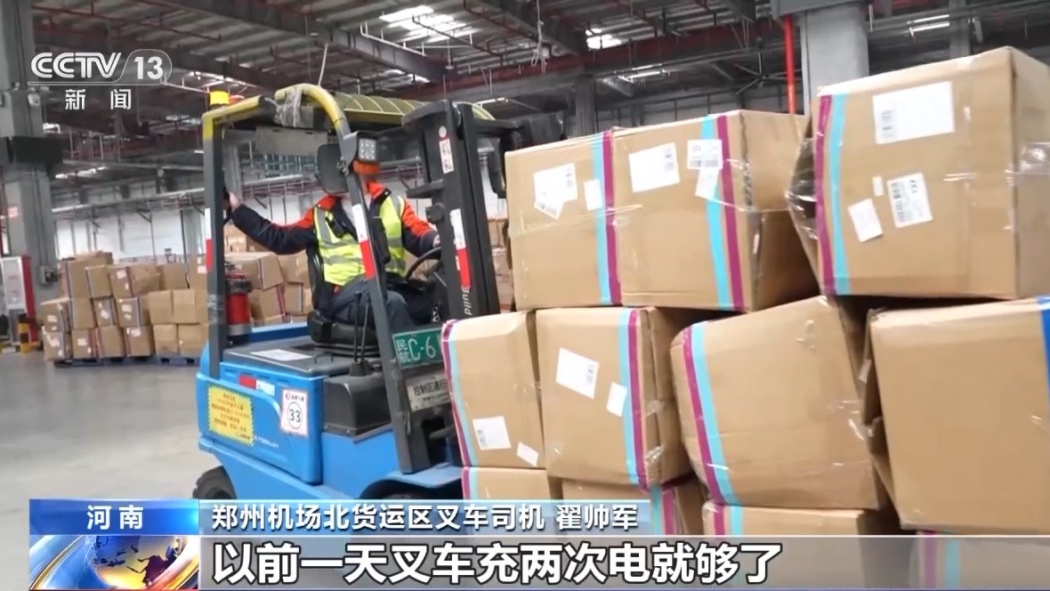 郑州机场北货运区叉车司机翟帅军:飞机航班多不多,装得满不满,看我这边就知道,以前一天叉车充两次电就够了,现在要充四次电。