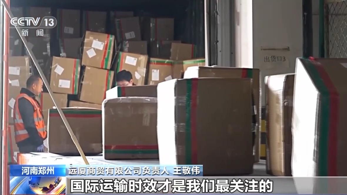 远厦商贸有限公司负责人 王敬伟:国内运输成本占整个物流成本是很小的,比如义乌到上海运费是0.5元每公斤,义乌到郑州运费是0.55元每公斤,占1%都不到。所以对于我们来说,选择郑州还是上海都是一样的,国际运输时效才是我们最关注的。