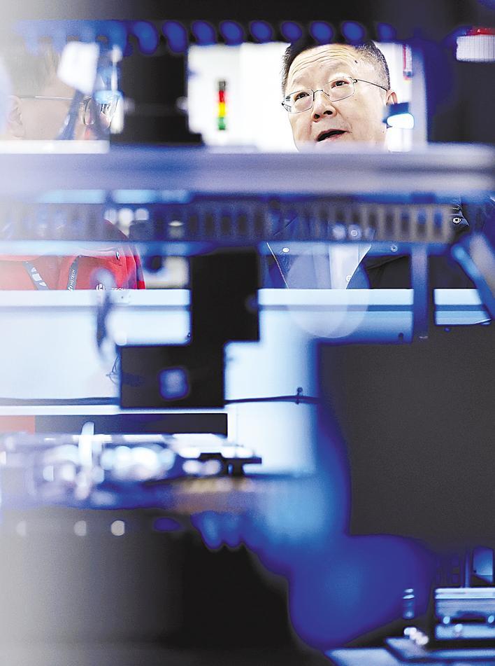华工科技董事长马新强身着蓝色工装,专注地站在机器旁,眼神紧紧跟随机械臂的每一次动作,不时与身旁的工程师低声讨论着算法优化。
