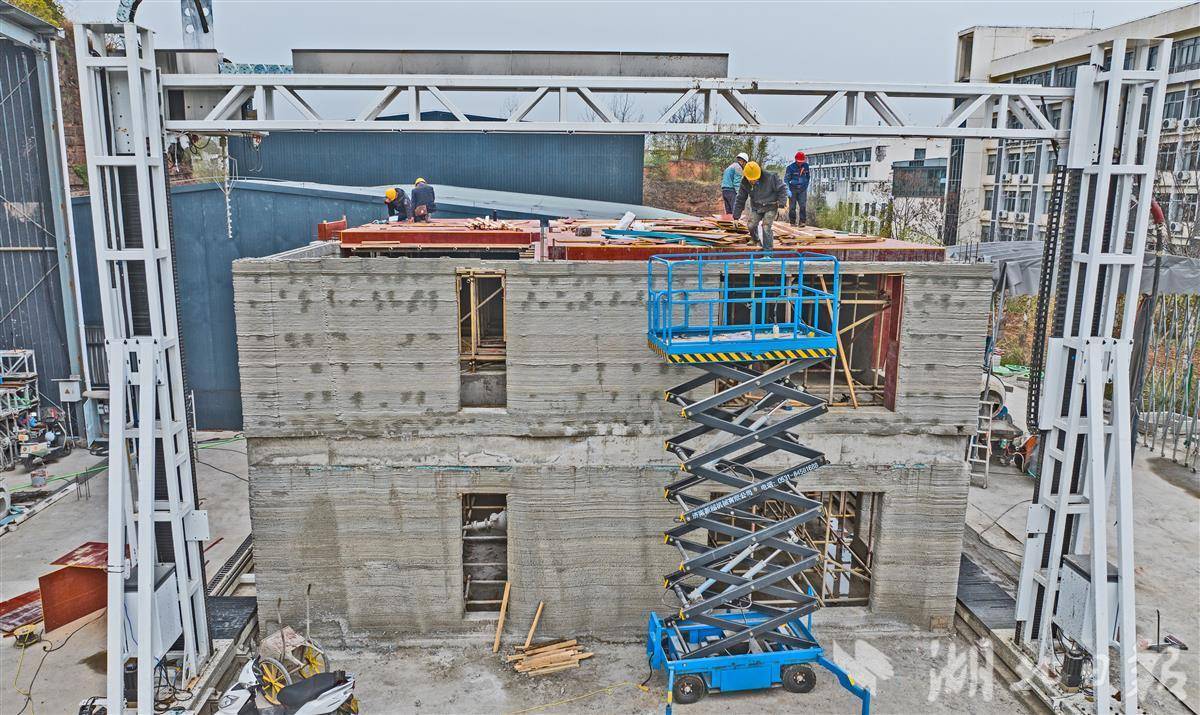 3月31日,在宜昌三峡大学的学校试验场,一栋由学校自行研发的12米级龙门式建筑3D打印机建设的双层小楼外形雏形实现,建筑工人正在进行顶楼封顶施工。这栋小楼高8米,占地100平方米,3月初开始打印,用时不足1个月,比传统建造工期缩短约70%,打印的效率和完整性达到预期效果。这台建筑3D打印机由学校历时3年研发而成,攻克了大尺度建筑3D打印技术在精度控制、结构连续性、打印连续性和结构稳定性等方面的难题。在试验过程中,研发团队通过参数和现场细节技术调整,将双层小楼的打印精度控制在2毫米内,定位精度控制在0.1毫米内,整栋小楼没有出现打印瑕疵。这次试验成功,标志着三峡大学12米级龙门式建筑3D打印机完成了从实验室到生产线的跨越,可正式进入产业化。(湖北日报全媒记者 刘曙松 通讯员 李正超 摄)