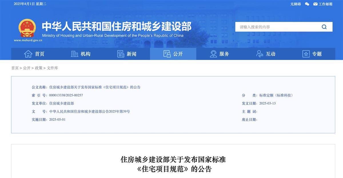 住房城乡建设部关于发布国家标准《住宅项目规范》的公告(来源:官网截图)