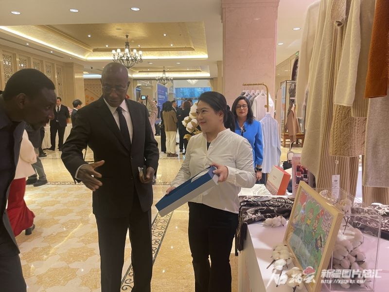 有关国家驻华使节对新疆特色产品展现出浓厚兴趣。石榴云/新疆日报记者 刘翔摄