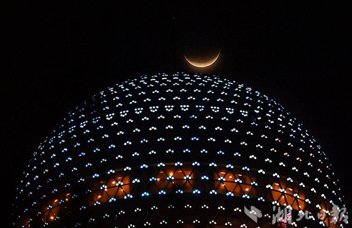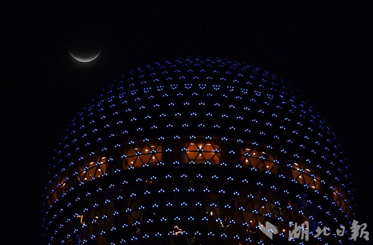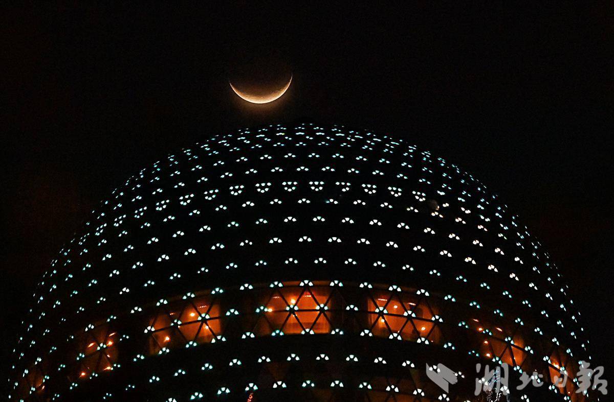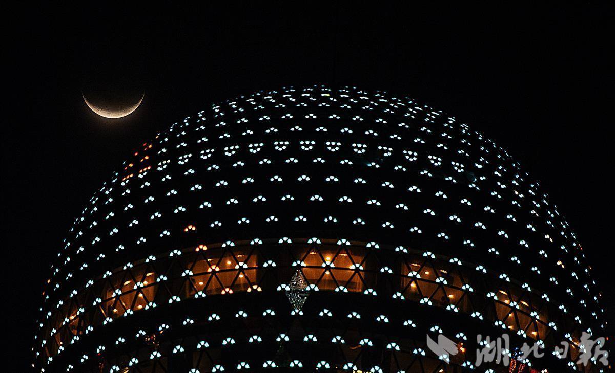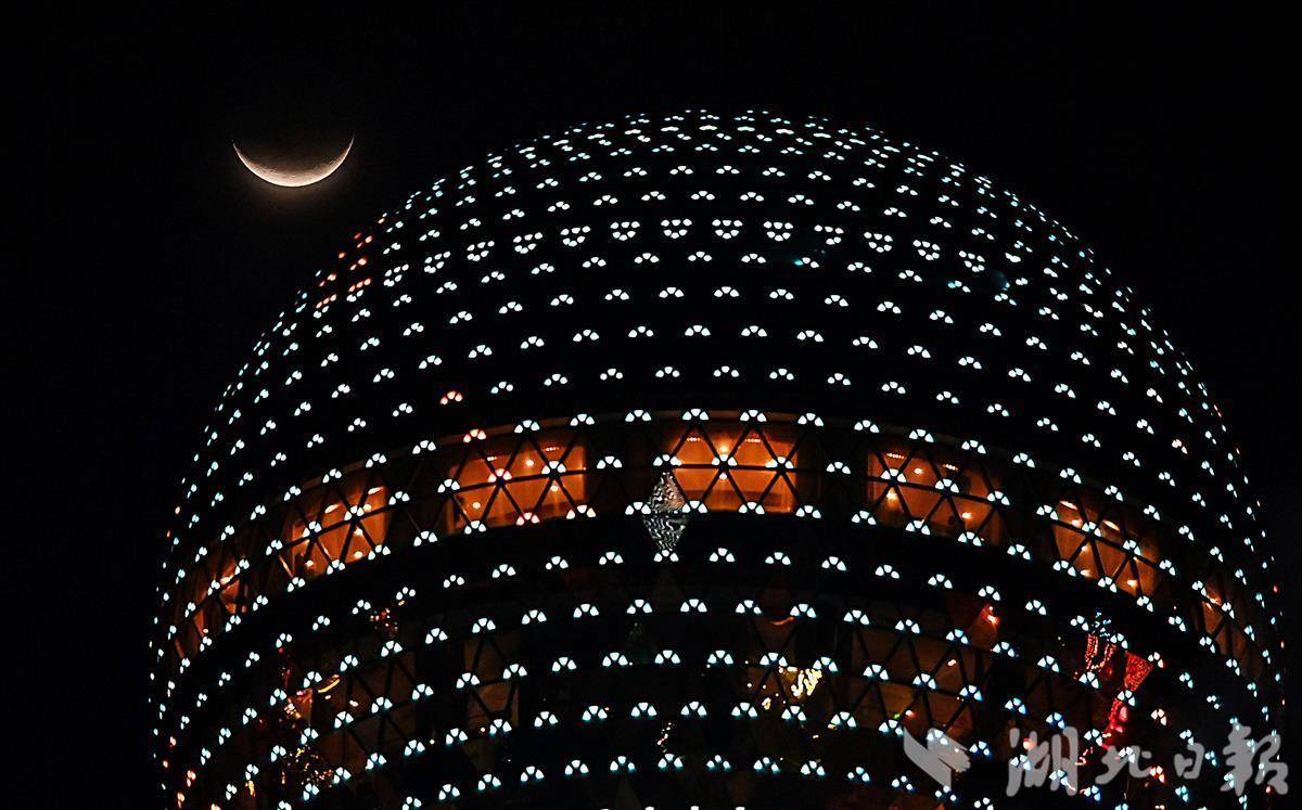 4月1日晚,许多市民游客在武汉汉口江滩目睹了本年度最大的一弯蛾眉月亮。当晚8时许,弯月如新裁柳叶,伴着武汉防洪纪念碑顶端的五星和江城明珠豪生大酒店形成独特景观。(湖北日报全媒记者 朱熙勇 摄)