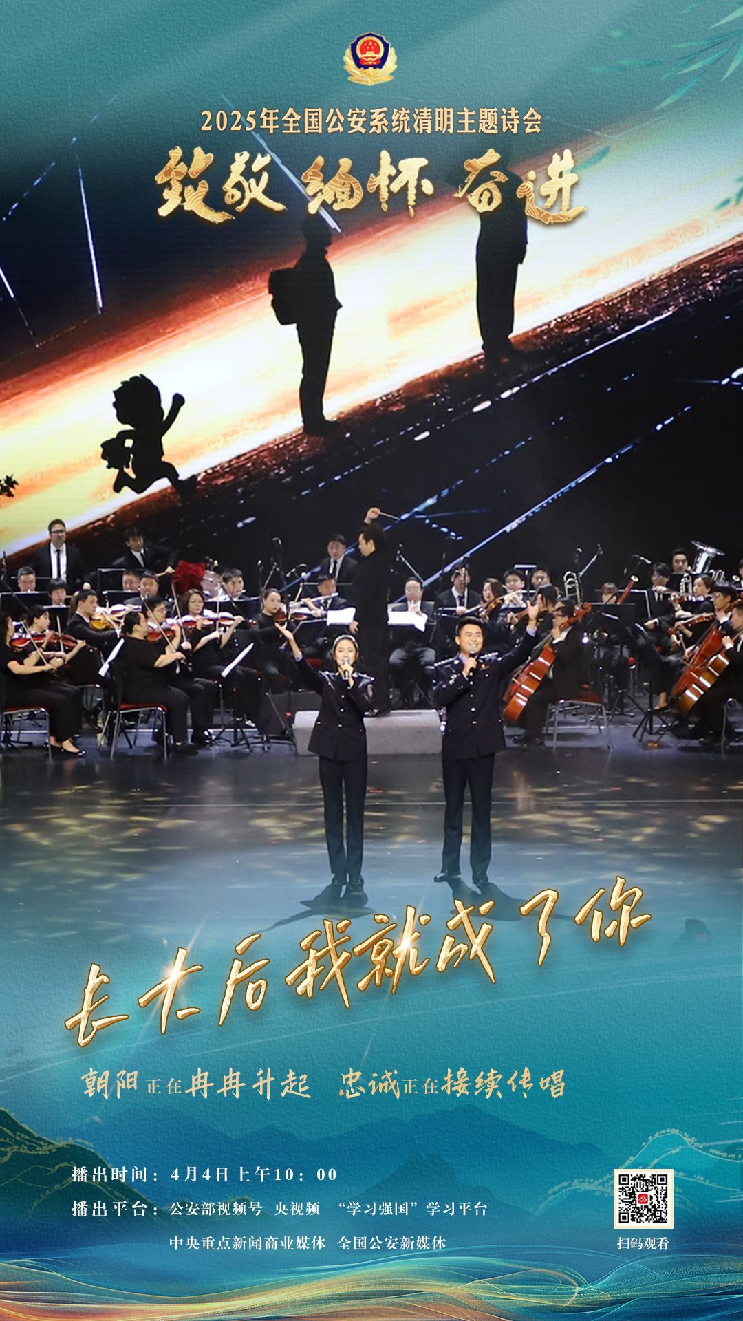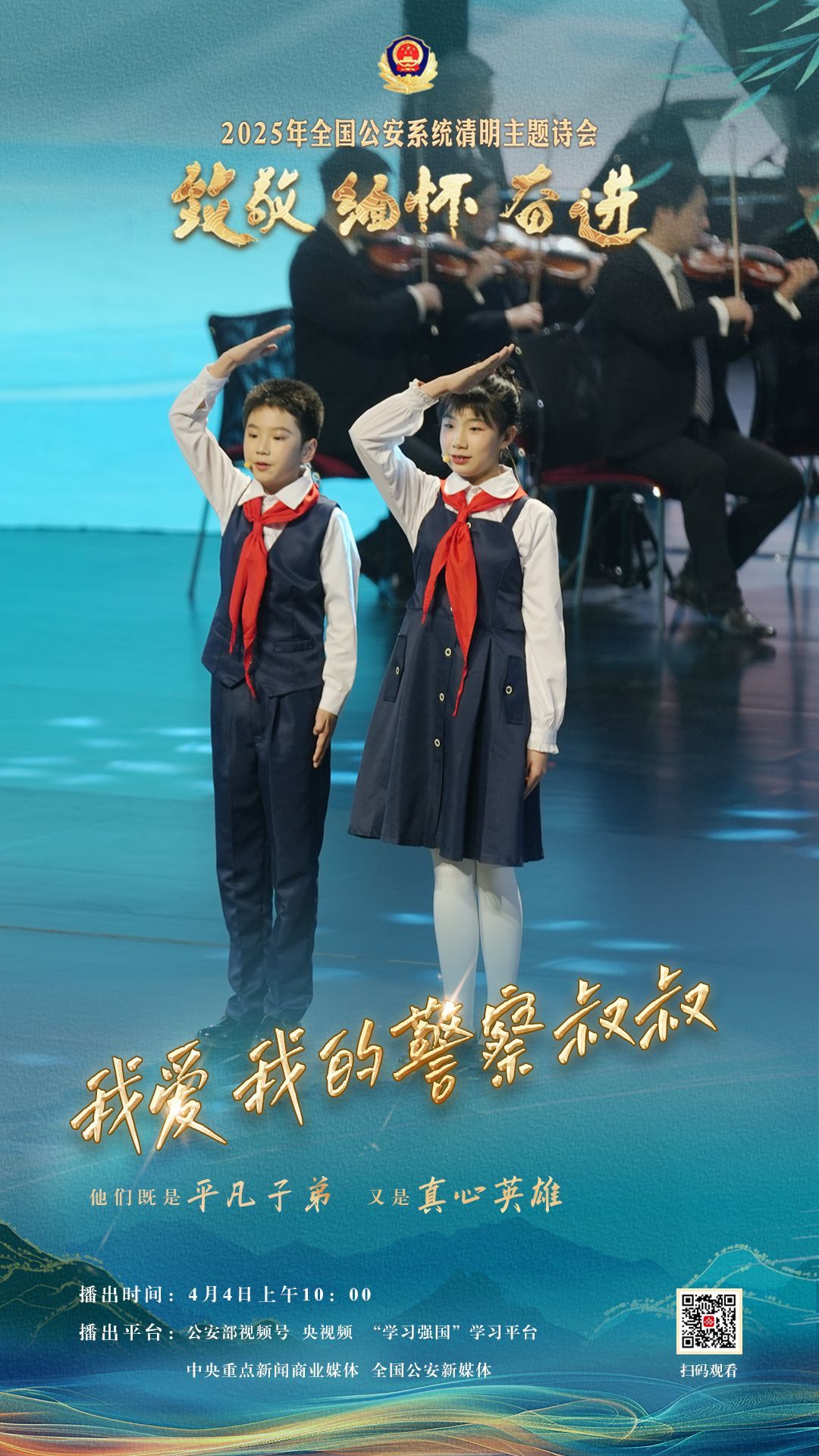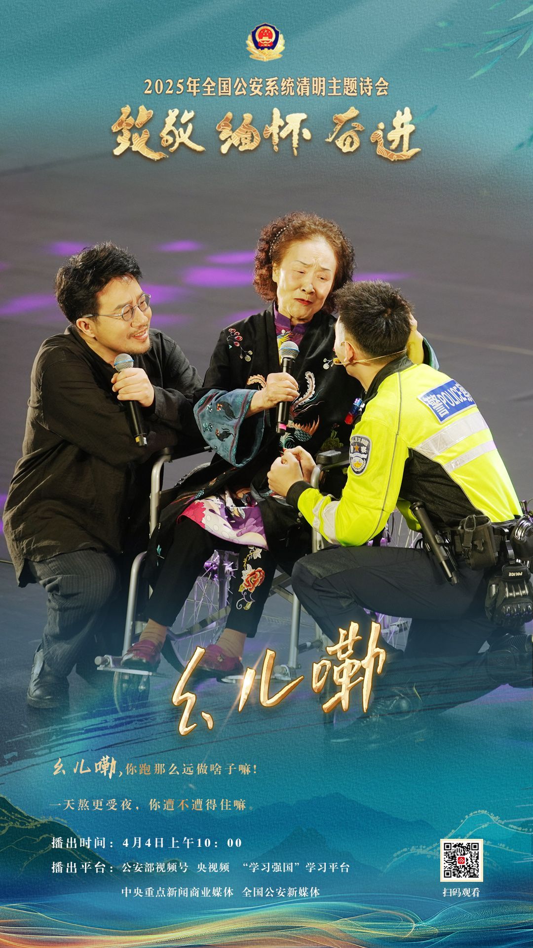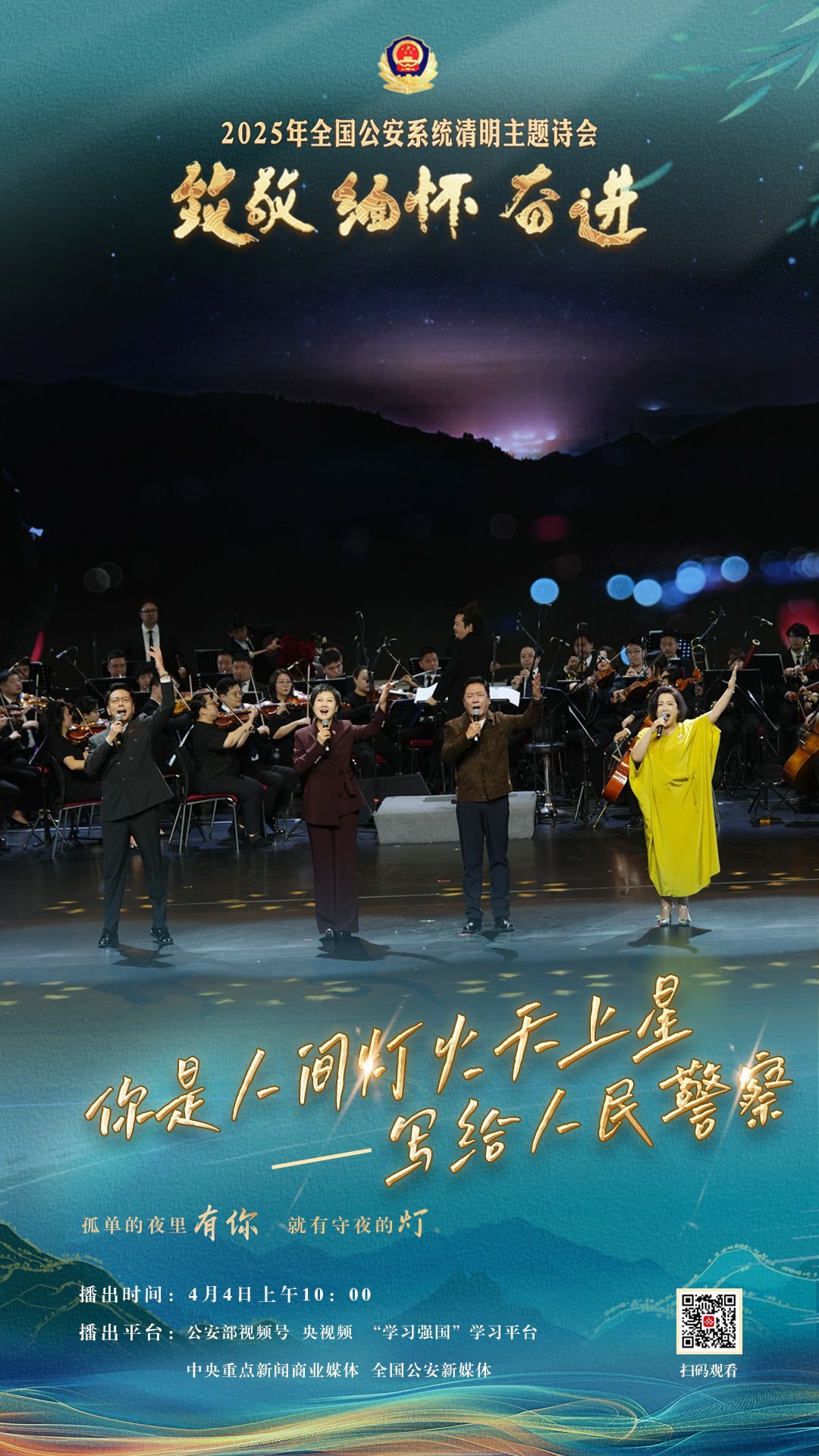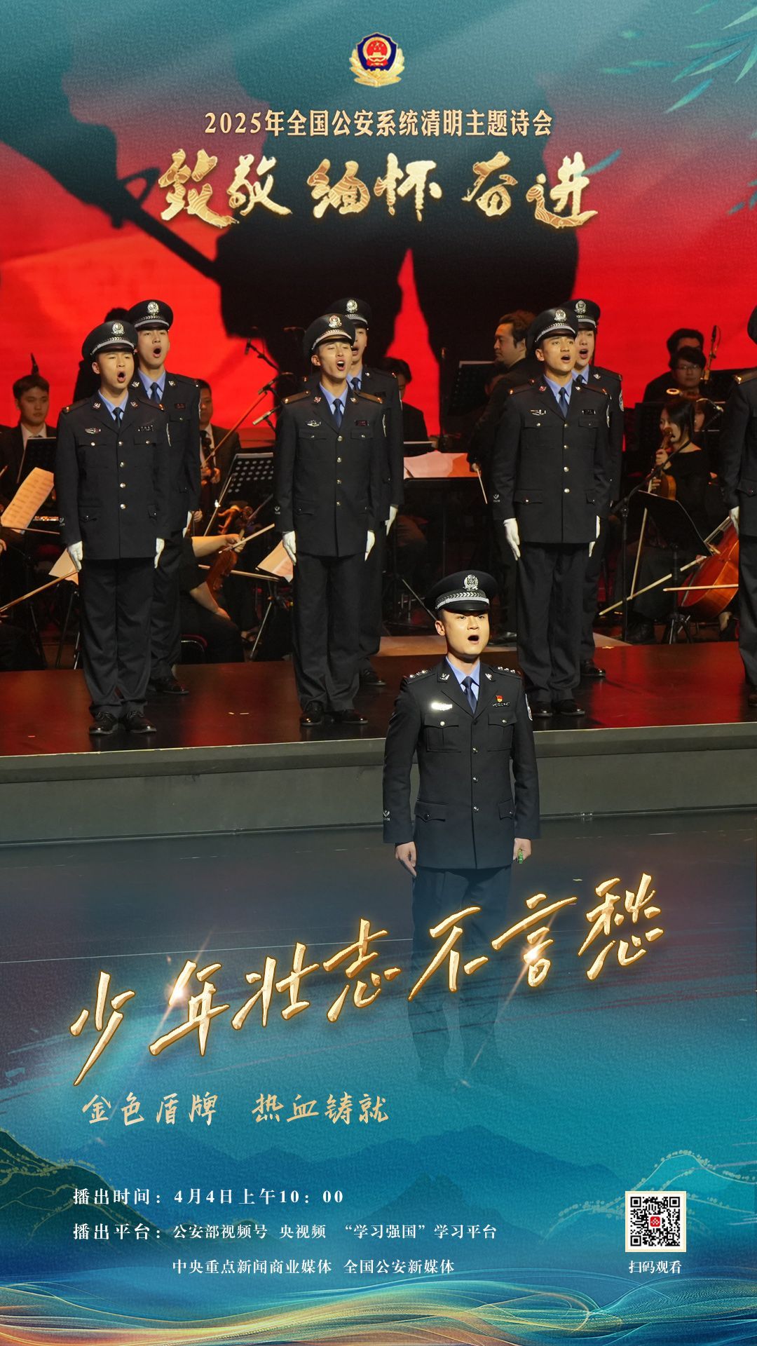 中国网4月2日讯(记者 王瑞芳)为充分展现全国公安机关和广大公安民警、辅警时刻铭记习近平总书记的关心关怀,时刻为党和人民而战的忠诚政治本色,深情追忆一年来公安系统涌现的英雄模范感人事迹,激励引导广大公安民警以更加奋发有为的精神面貌,坚决履行好党和人民赋予的神圣职责使命,今年清明节当天,公安部新闻宣传局、全国公安文联、四川省公安厅联合举办“致敬·缅怀·奋进”2025年全国公安系统清明主题诗会。