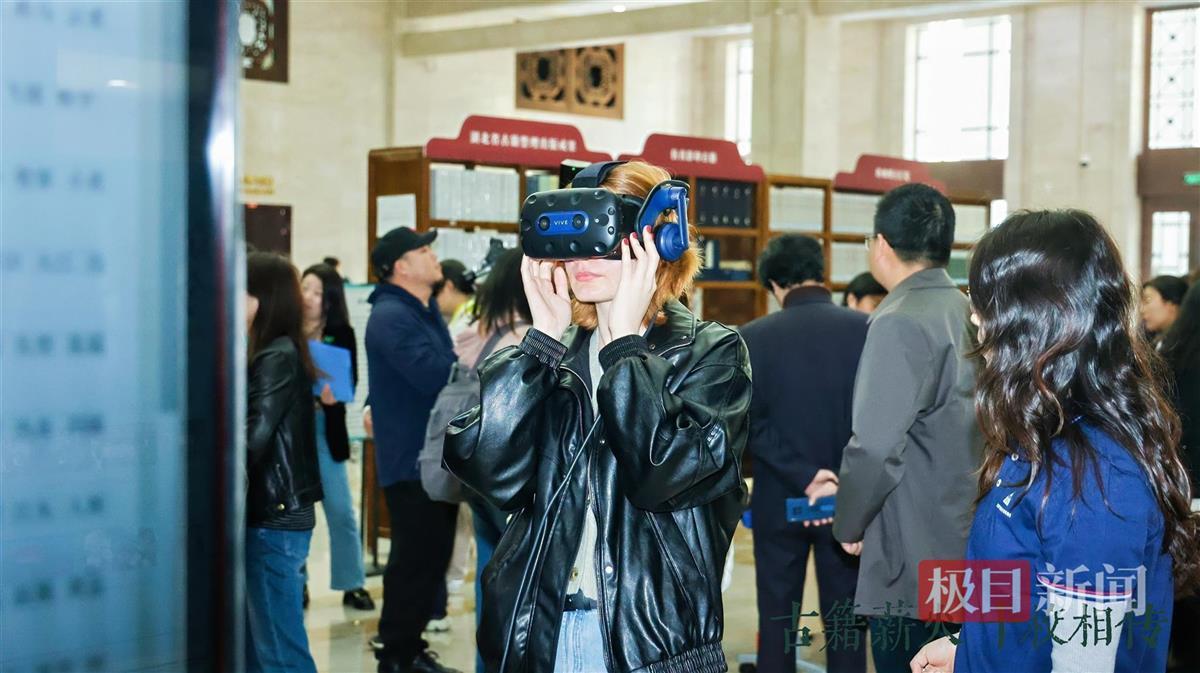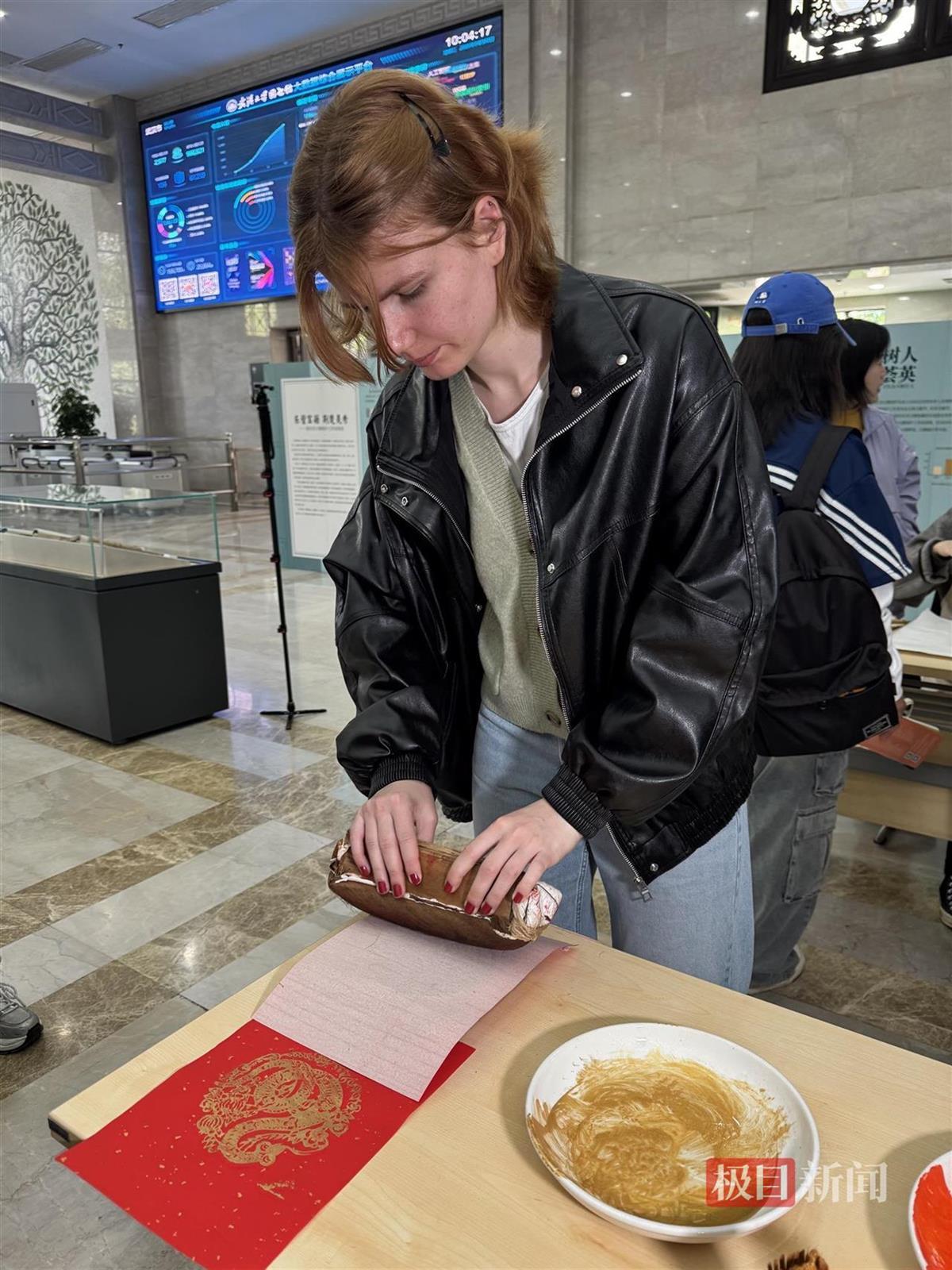 现场,省级非遗传承人现场演示古籍修复技艺,吸引师生参与。来自法国的研究生Camille Batard,来武汉大学交流实习,当天也在现场参与了古籍沉浸式互动体验,感受中华文化的博大精深。