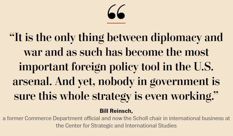正如美国战略与国际问题研究中心专家比尔·赖因施所说,制裁“作为介于外交与战争之间的唯一东西”已成为美国最重要的外交政策工具,“然而(美国)政府中没有人能确定这套战略是否奏效”。