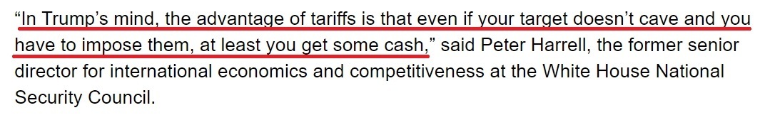 白宫国家安全委员会前高级官员彼得·哈雷尔说得更明白:“在特朗普看来,关税的好处是,即使你(想要惩罚)的目标不屈服,而你不得不对其征收关税,至少你能得到一些真金白银。”