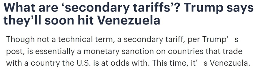 特朗普曾于3月24日宣布,鉴于委内瑞拉对美国充满“敌意”,他将对购买委石油和天然气的国家征收25%的“二级关税”。