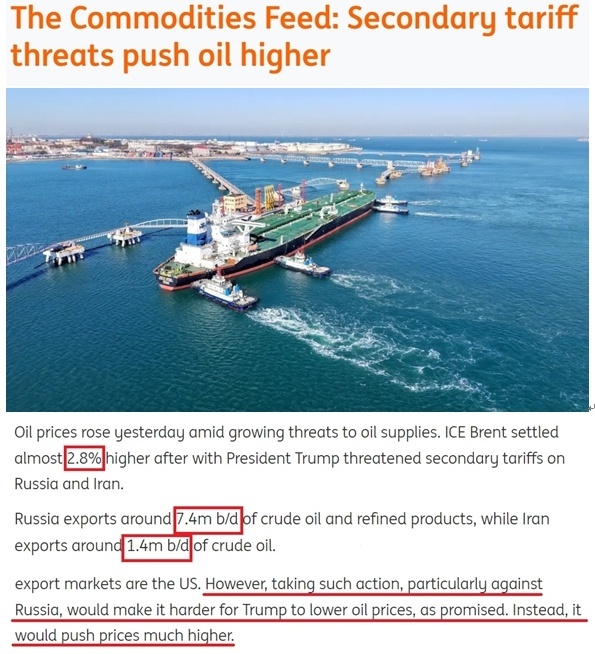 据业内分析,鉴于两国的石油出口对于稳定全球供应至关重要,如果针对它们的“二级关税”从口头威胁变成现实,不仅不会像特朗普声称的那样“降低油价”,反而会把油价推得更高。