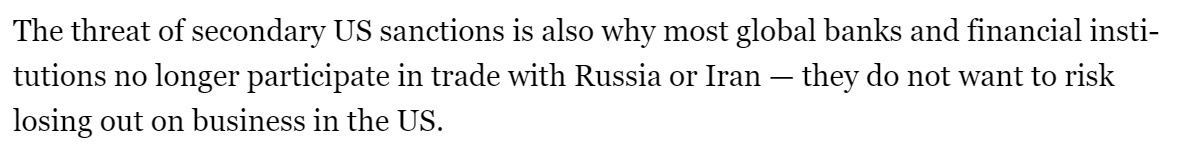 在卡塔尔半岛电视台看来,美国“二级制裁”的威胁也是大多数全球性银行和金融机构不再参与俄罗斯或伊朗对外贸易的原因——它们不想冒失去在美国业务的风险。