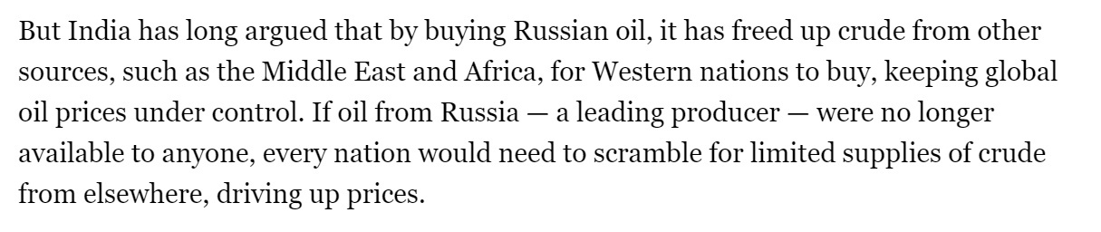 但印度强调,通过购买俄罗斯石油,它可以“腾出”更多中东和非洲等其他地区的石油供西方国家购买,从而使全球油价处于可控水平。如果作为主要产油国的俄罗斯无法出口石油,那么每个国家都需要从其他地方争夺有限的石油供应,从而推高国际油价。
