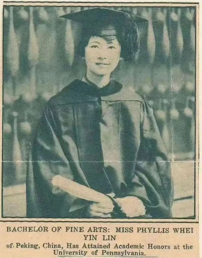 1927 年,林徽因在宾夕法尼亚大学的毕业照。由于当时宾大建筑系不招收女生,她只能改修艺术学院。但是就读期间她选修了建筑系的所有课程,成绩优异。1927 年她以美术学士学位毕业,后得到宾大建筑设计的指导教师职位。在2024年5月,宾大向林徽因追授了建筑学士学位,毕业年份为“1927”。