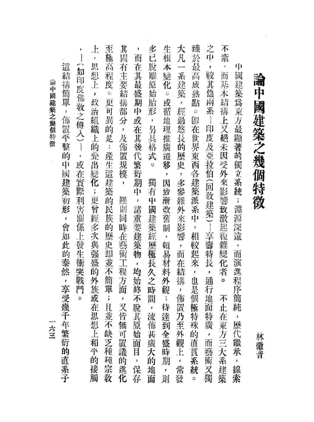 《论中国建筑之几个特征》,发表于《营造学社汇刊》第三卷第一期,署名“林徽音”,林徽因系1935年改名。