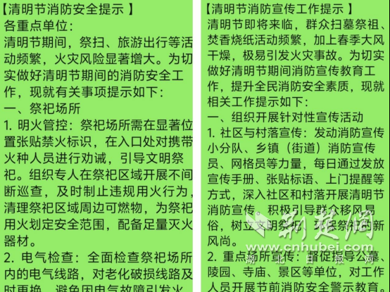 此外,荆州区消防救援大队还通过微信群向200余家重点单位及各部门发送消防安全工作提示。提示内容涵盖清明节期间火灾防范要点、应急处置方法等知识,要求各单位认真开展消防安全自查自纠,加强对员工的消防安全教育,确保一旦发生火灾,能够迅速有效处置。此举极大地提高了重点单位和相关部门对清明节期间消防安全工作的重视程度,营造了浓厚的消防安全宣传氛围。