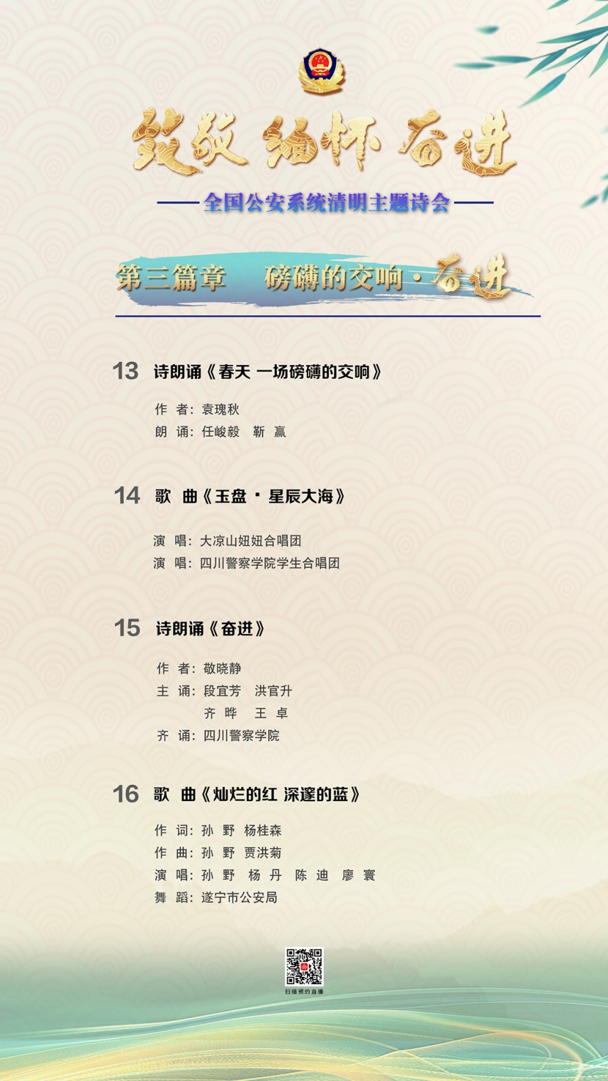 2025年4月4日10点,公安部新闻宣传局、全国公安文联、四川省公安厅联合举办“致敬·缅怀·奋进”2025年全国公安系统清明主题诗会,致敬那些用生命守护平安的公安英烈。此次诗会将在公安部视频号、央视频、“学习强国”学习平台、中央重点新闻网站、主要商业网站及其新媒体播出。
