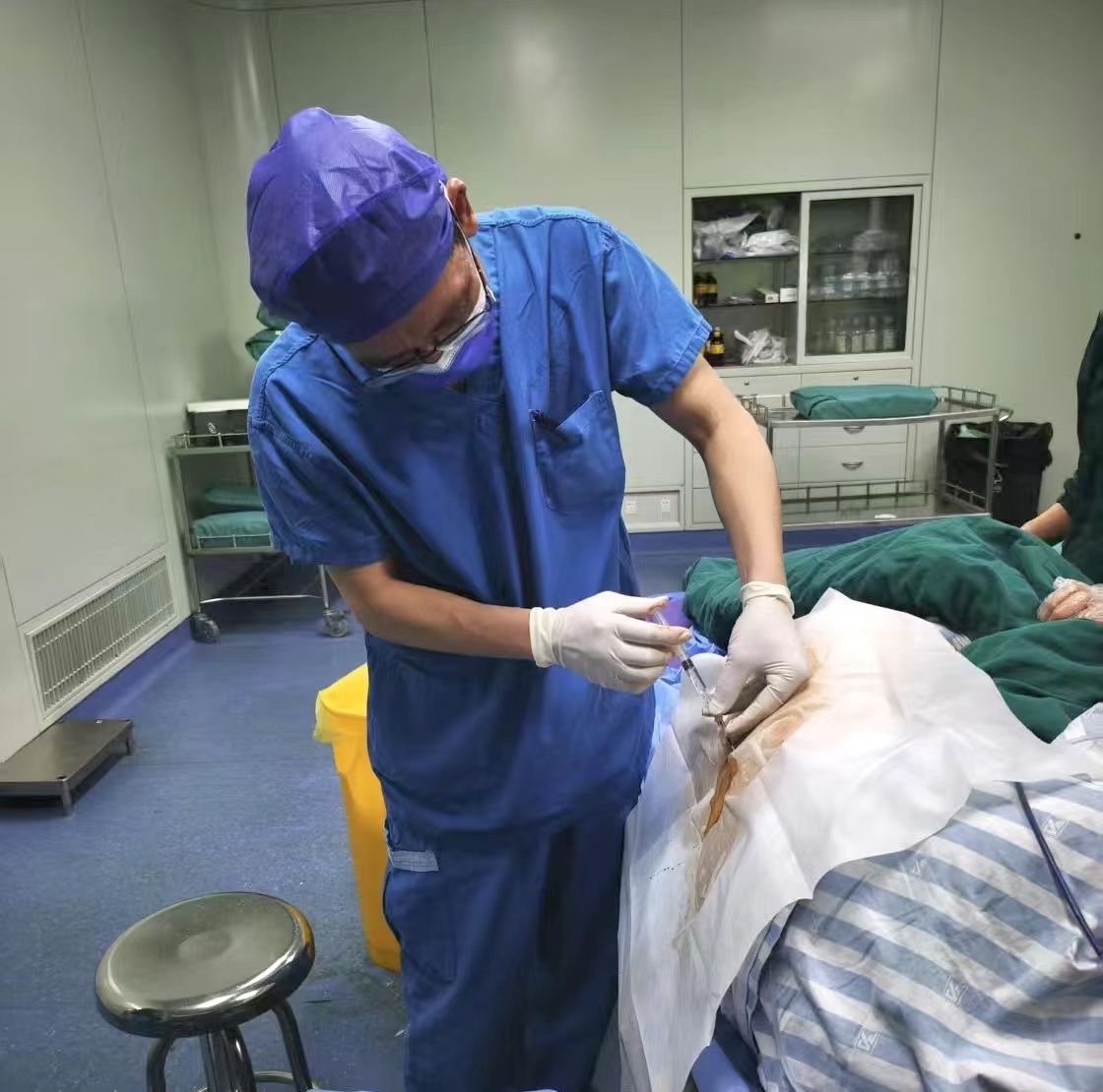 3 月 11 日,手术室的无影灯准时亮起。麻醉科副主任沈述威半弓着腰,指尖在老人侧弯的脊柱表面反复触诊,采用侧入路避开钙化椎体,将麻醉药剂精准注入腰椎间隙。