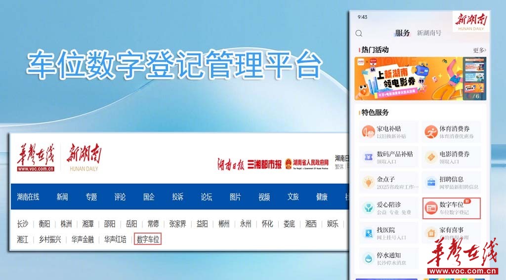 1.网页端进入华声在线:https://www.voc.com.cn/,在首页导航条点击“数字车位”登记、查询车位信息。