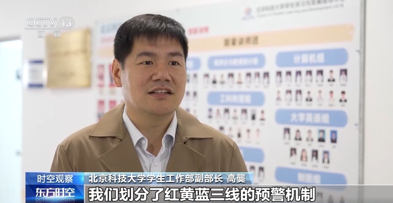 北京科技大学学生工作部副部长 高龑:我们划分了红黄蓝三线的预警机制,如果学生已经有学业警示,或者是即将面临学业警示,我们就要把他放到红线关注里面;如果学生的必修课学分完不成70%,我们就要把他放到黄色预警里面;所有有挂科的学生,我们都要把他放到蓝色预警里面。通过早发现、早干预、早处理,希望他刚出现挂科的情况下,就能够得到一定的外界的辅导和支持。