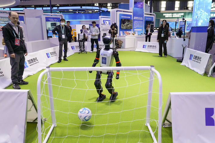 2025年3月27日,在中关村展示中心常设展内,参观者在观看一款名为“加速T1”(Booster T1)的人形机器人踢足球。新华社记者鞠焕宗 摄