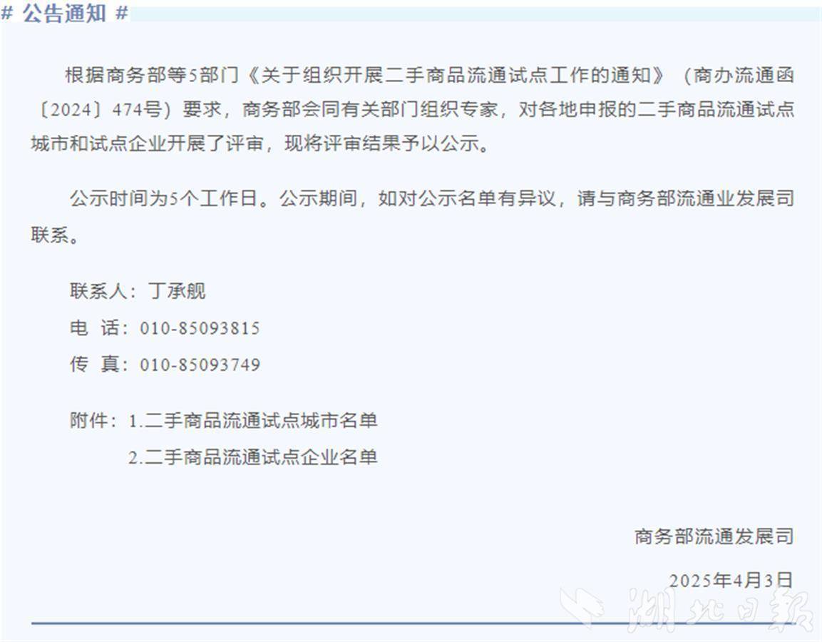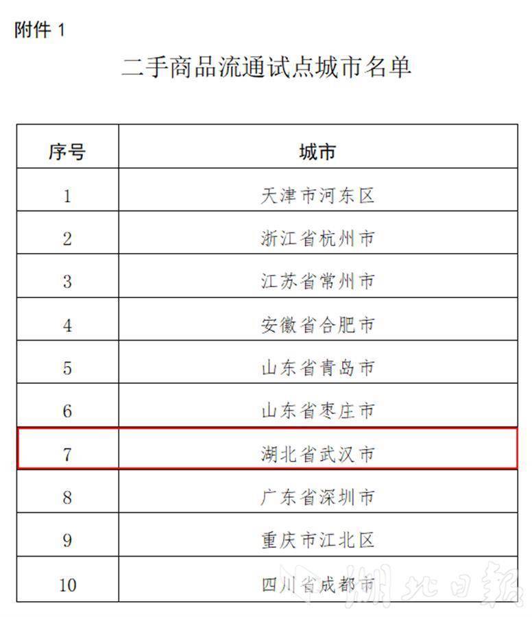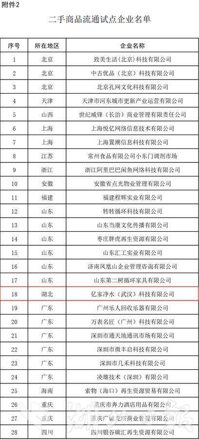 湖北日报讯 (记者黄磊、通讯员赵燕)4月3日,商务部官网发布《关于二手商品流通试点城市和试点企业评审结果的公示》,武汉市入选全国首批试点城市,亿家净水(武汉)科技有限公司入选首批试点企业。