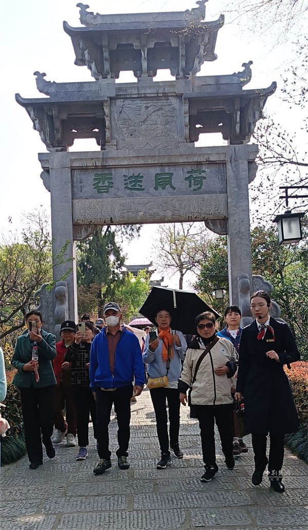 游玩过程中,环卫工人们一边聆听讲解员将黄鹤楼的传说轶事、历史典故、诗词故事以及黄鹤楼建筑的精妙之处娓娓道来,一边游赏春日风光,一路欢声笑语不断。