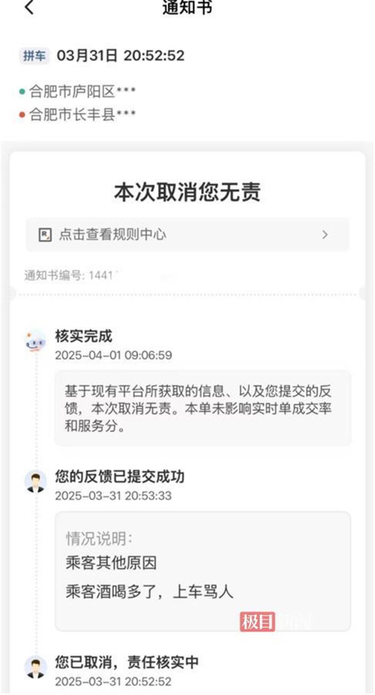 盛先生并不认为自己属于拒载。他指出,根据当时的情况,综合评估认为乘客酒后的行为可能影响行车安全,才与对方沟通取消订单。事后,网约车平台已联系他了解情况。他提供的平台信息显示,盛先生取消订单无责。
