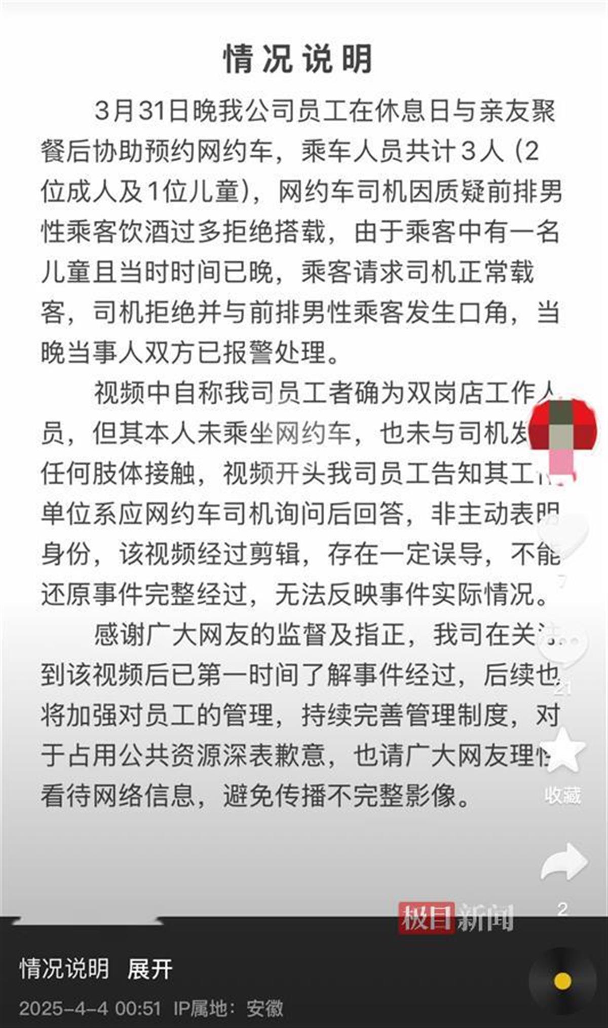 盛先生表示,那名辱骂威胁她的女乘客自称是合肥某品牌餐饮公司的员工。4月4日凌晨,该餐饮公司发布情况说明,确认该乘客是该公司某分店的工作人员,并称此事因司机拒载引起。4月4日,记者多次致电该餐饮公司公开电话,均无人接听。上述分店工作人员表示对此事不知情。目前,该餐饮公司已删除情况说明。