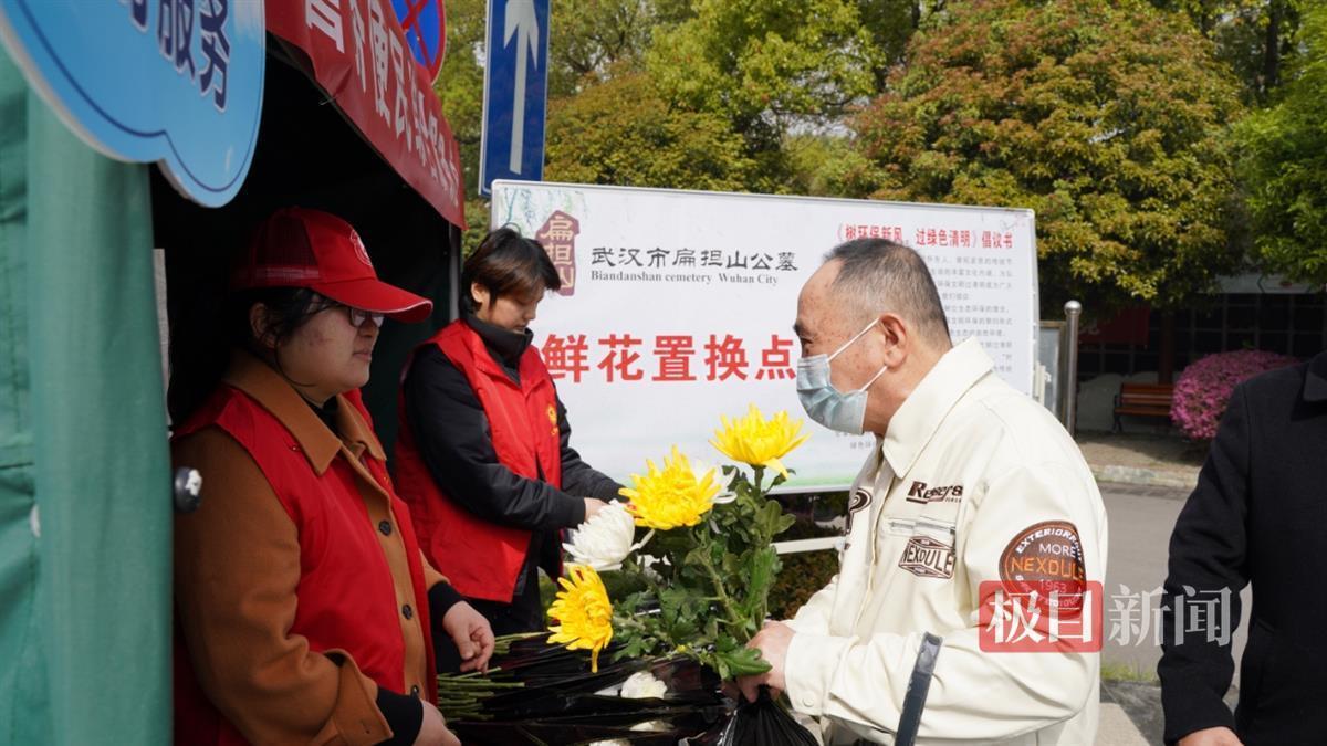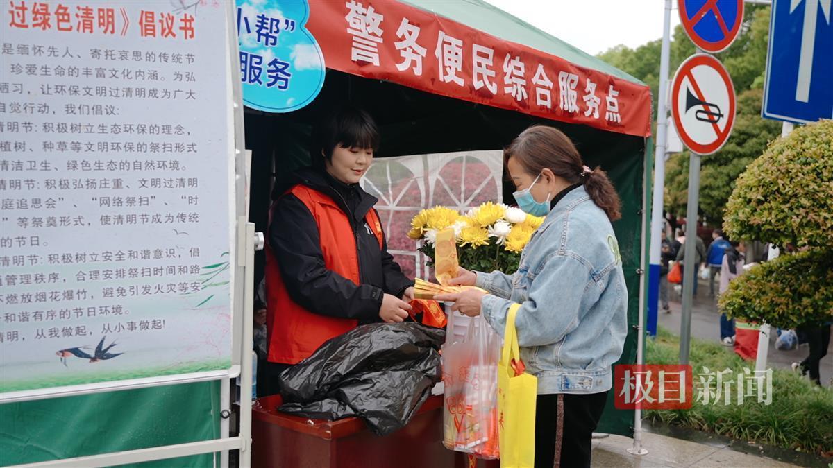 极目新闻记者发现,在园区入口处的醒目位置,设有“文明祭扫·换取鲜花”服务点,志愿者正一边用鲜花换掉市民手中的纸钱等焚烧祭品,一边向群众宣传绿色环保祭扫理念。