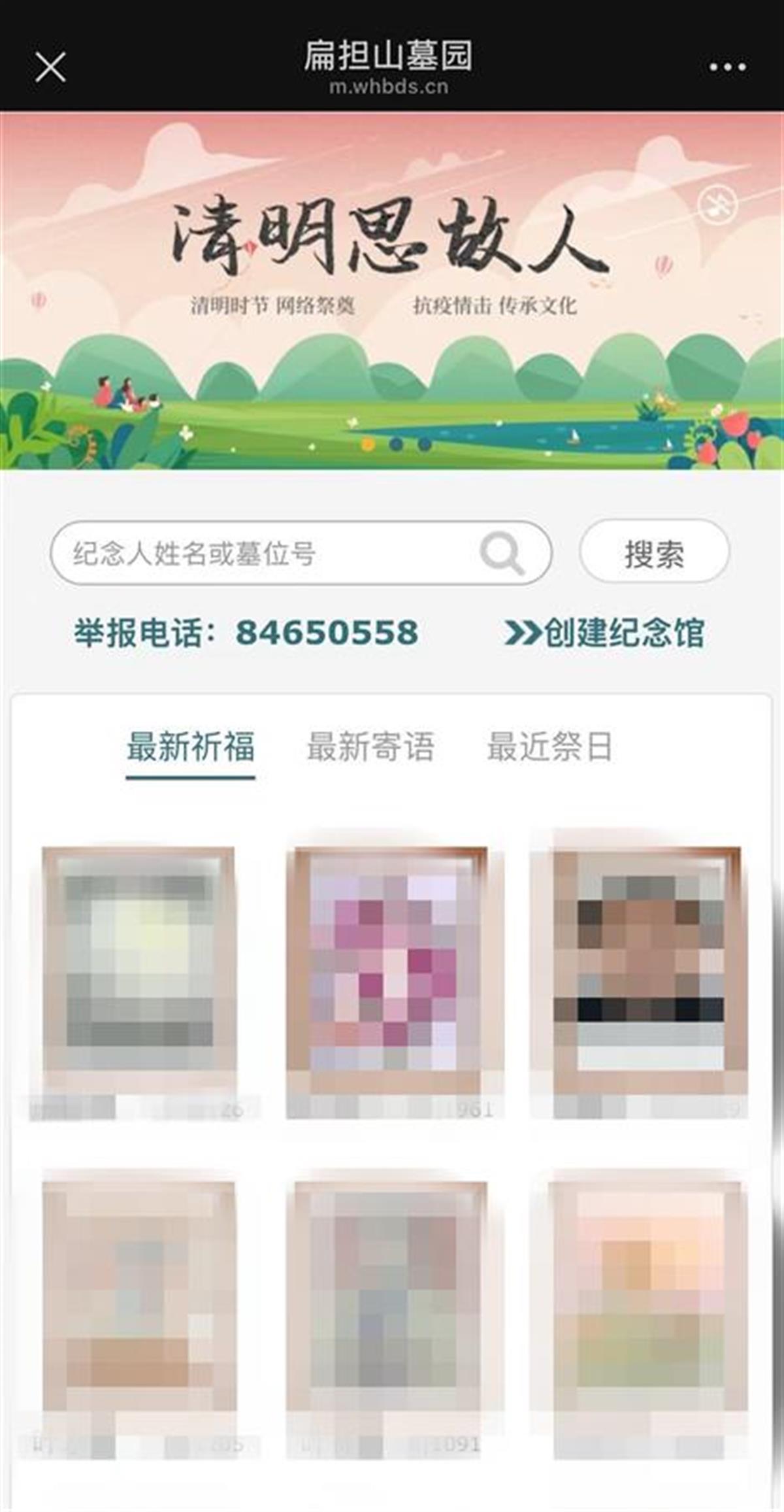 “扁担山公墓依托官方网站和微信公众号开通了网络祭扫服务,个人可以在网上为逝者建立网络纪念馆。”扁担山公墓相关负责人介绍,逝者家属可自己创建纪念馆,选择设置背景、音乐,填写墓志铭,可以分享亲人纪念堂给其他亲人朋友,共同缅怀追思先人。