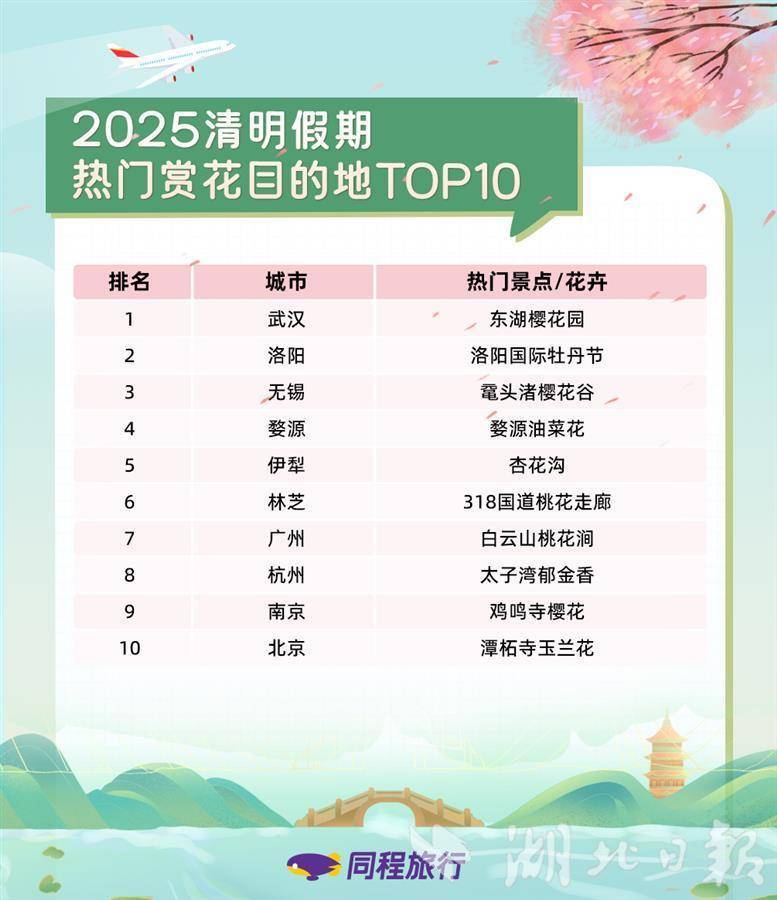 湖北日报讯(记者冯袁玥、通讯员武文旅)清明假期,武汉文旅市场火热。铁路12306数据显示,武汉位居全国十大热门出发和热门到达城市,携程平台上,武汉机票订单量同比去年增长13%,已跻身主要赏花目的地。同程旅游数据称,武汉东湖樱花园居全国热门赏花目的地首位。