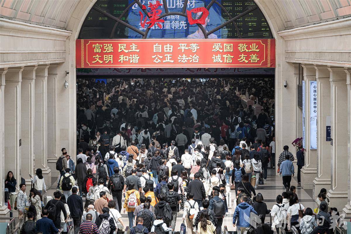 4月6日,武汉铁路迎来清明假期返程客流高峰,旅客抵达汉口火车站有序出站。(湖北日报全媒记者 任勇 摄)