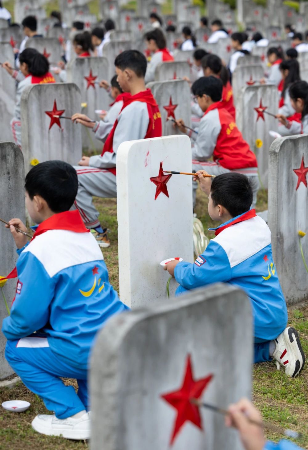 3月31日,在川陕革命根据地红军烈士陵园,通江县沙溪初级中学和沙溪镇中心小学的学生们一笔一画地为无名烈士碑身上的五角星描红。新华每日电讯记者江宏景摄