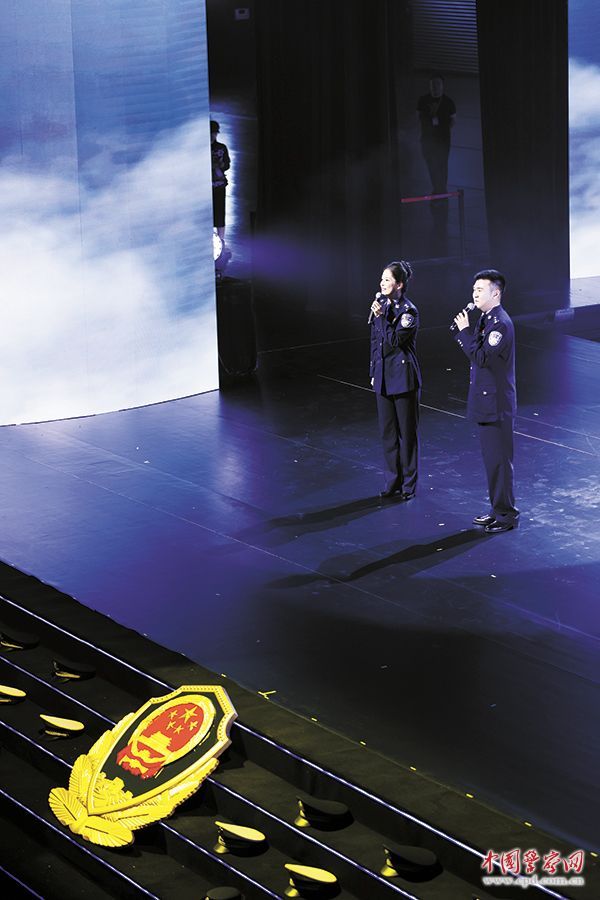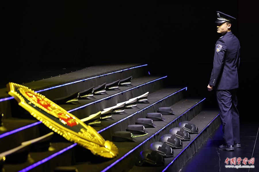 舞台前方,庄严的警徽在聚光灯下熠熠生辉,警徽周围摆放着4排警帽。“‘4’代表2024年,又与‘逝’谐音,我们想通过舞台布置,让观众直观感受到我们对公安英烈和牺牲战友的深情追忆。”陈姜说。