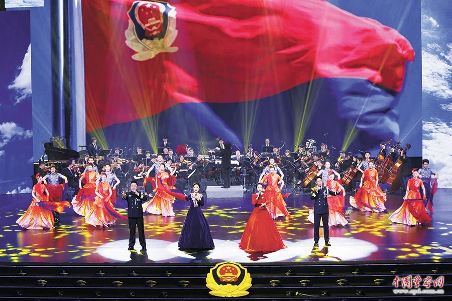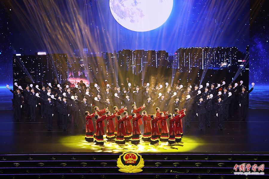 在催人奋进的歌声中,历时70分钟的诗会进入尾声。在最后一个节目《灿烂的红 深邃的蓝》里,民警们高举红蓝交织的丝绸在舞台上奔跑,织出一面铺满舞台的旗帜。