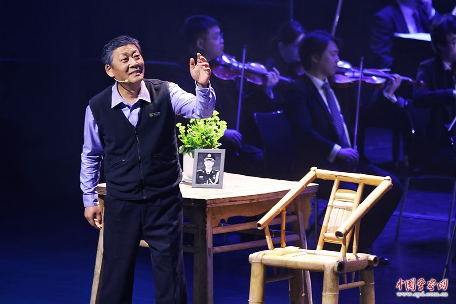 舞台渐渐暗了下来,一束灯光照亮桌上的黑白照片,旁边是挂在衣架上的警服。全国公安系统二级英模、吉林省临江市副市长、公安局局长夏琨牺牲后,父亲只能抱着警服、对着照片思念他。