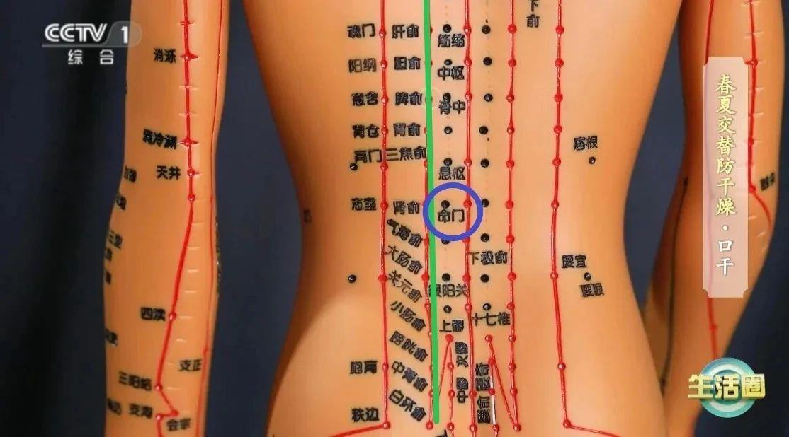命门穴:可先找到髂嵴,两侧髂嵴连线平对第4腰椎棘突,向上推2个棘突即为命门穴。