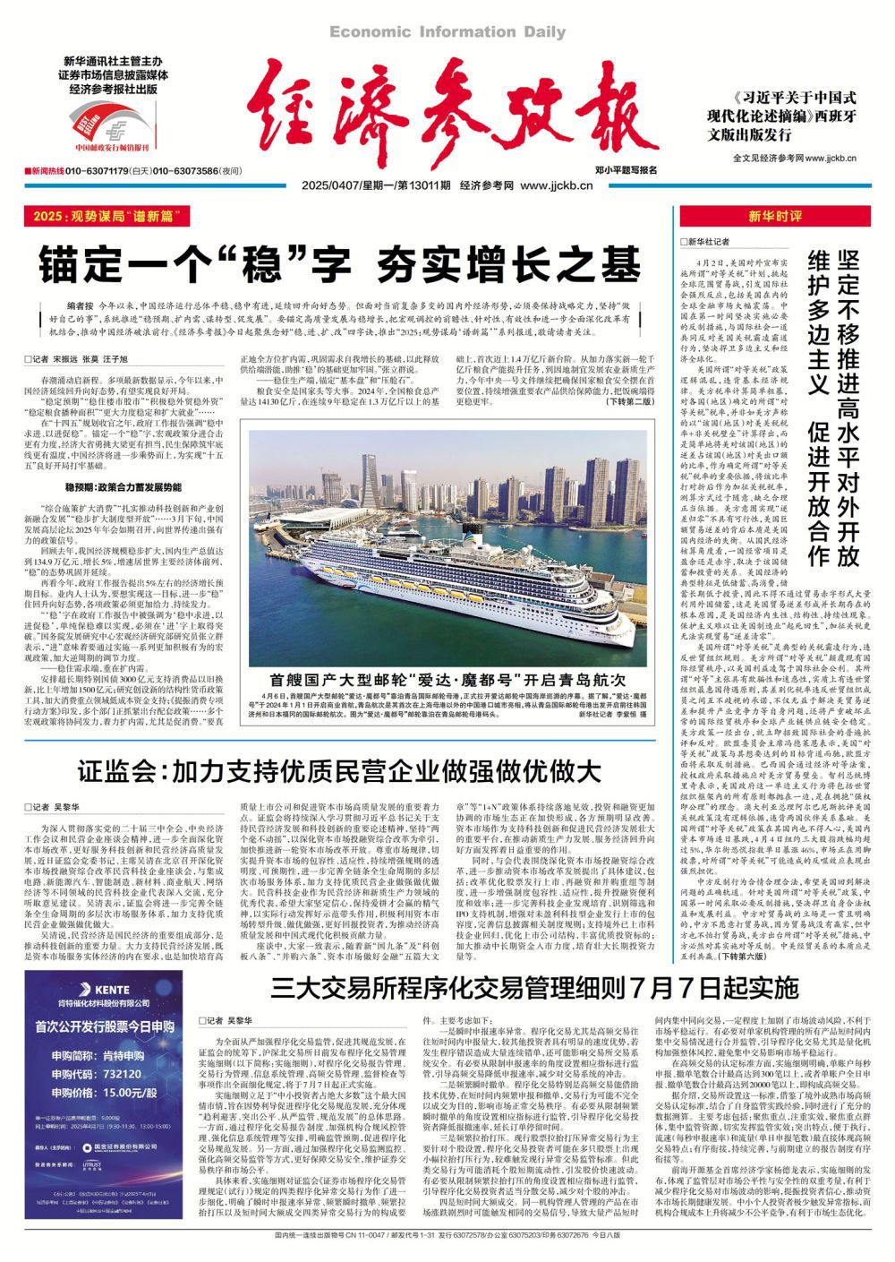 编者按 今年以来,中国经济运行总体平稳、稳中有进,延续回升向好态势。但面对当前复杂多变的国内外经济形势,必须要保持战略定力,坚持“做好自己的事”,系统推进“稳预期、扩内需、谋转型、促发展”。要锚定高质量发展与稳增长,把宏观调控的前瞻性、针对性、有效性和进一步全面深化改革有机结合,推动中国经济破浪前行。《经济参考报》今日起聚焦念好“稳、进、扩、改”四字诀,推出“2025:观势谋局‘谱新篇’”系列报道,敬请读者关注。
