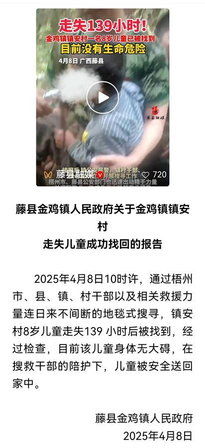 据广西藤县金鸡镇人民政府通报:2025年4月8日10时许,通过梧州市、县、镇、村干部以及相关救援力量连日来不间断的地毯式搜寻,镇安村8岁儿童走失139小时后被找到,经过检查,目前该儿童身体无大碍,在搜救干部的陪护下,儿童被安全送回家中。