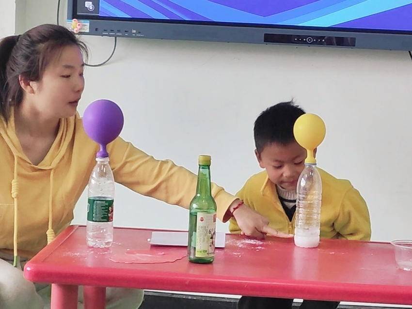见孩子们兴趣盎然,老师趁机揭晓了实验原理:原来,小苏打与白醋相遇后会发生化学反应,释放出大量的二氧化碳气体。这些气体迅速充满瓶子,进而涌入气球中,使得气球不断膨胀。