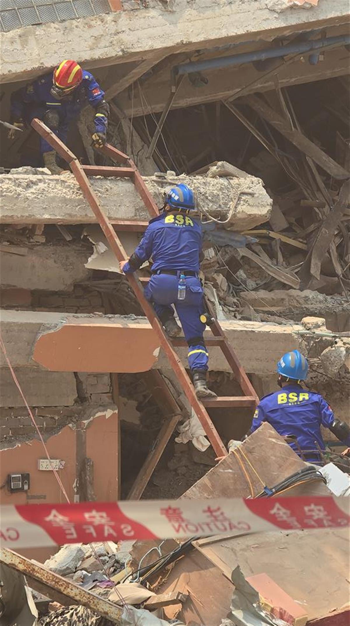 蓝天救援队队员进入长城酒店垮塌的楼体搜救(极目新闻记者满达摄)