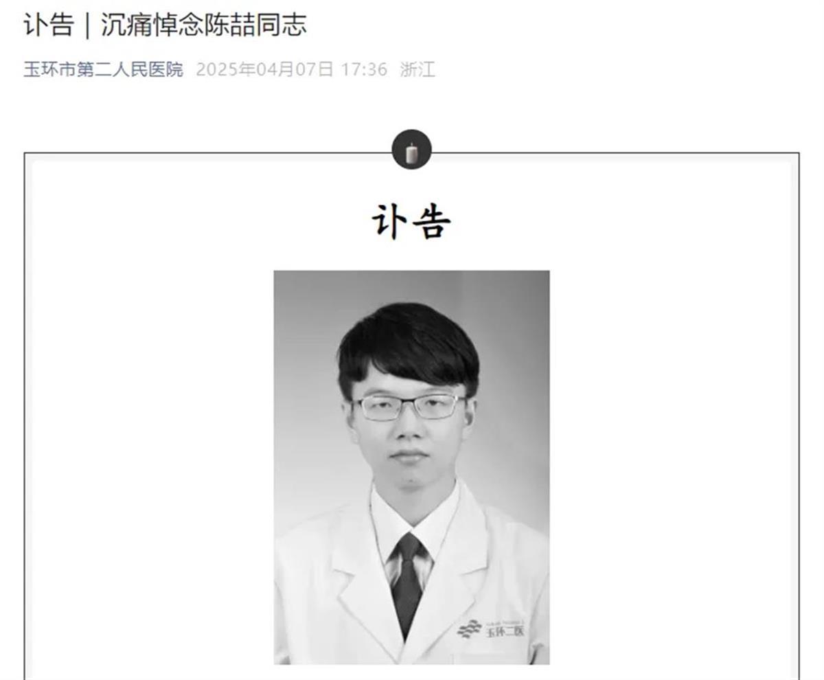 4月7日,浙江省玉环市第二人民医院发布讣告:玉环市第二人民医院骨科主治医师陈喆同志,因在工作期间突发呼吸心跳骤停,尽管经医院全力抢救,仍于2025年4月6日凌晨2时30分不幸离世,享年35岁。(据4月8日潇湘晨报报道)