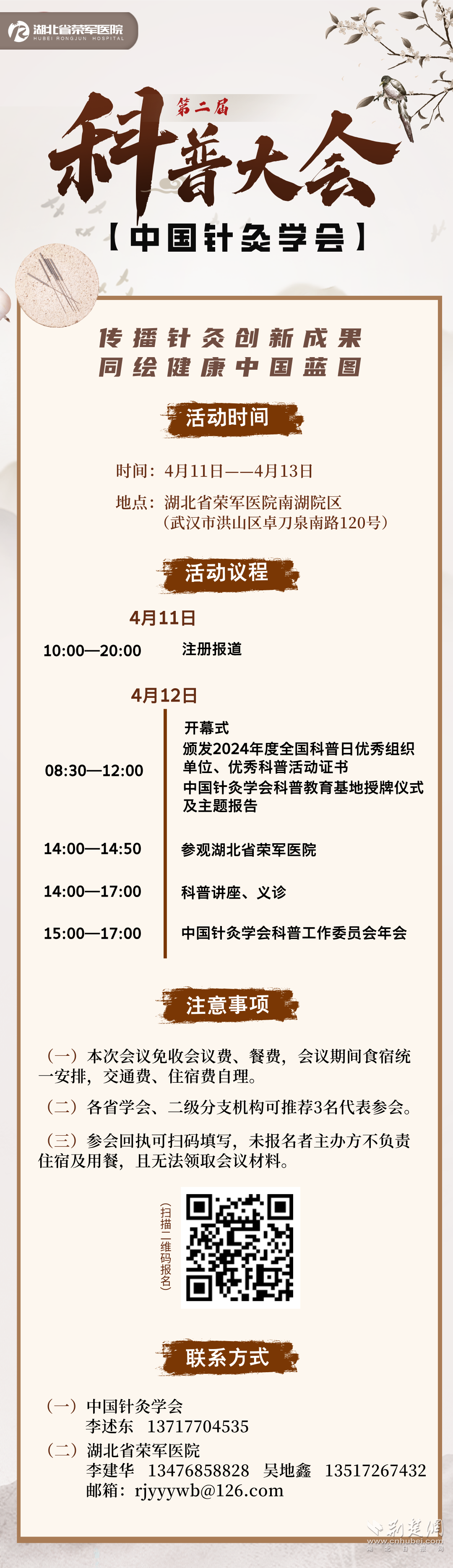 荆楚网(湖北日报网)讯(通讯员袁鸣)为普及中医针灸知识、传播中医药健康文化,营造良好的中医针灸发展环境,不断提升学会科普能力建设,中国针灸学会定于4月11日至4月13日在湖北医养康复中心召开中国针灸学会第二届科普大会,特邀院士专家出席,并开展义诊活动,敬请期待。