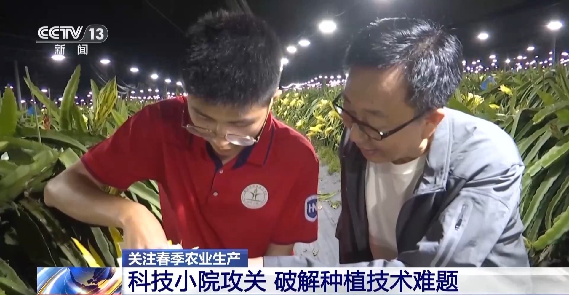 不仅仅是燕窝果,像传统的热带水果火龙果的种植难题,也正在通过科技小院的技术得以攻破。晚上八点多,尖峰镇方圆几十里火龙果种植园区灯火通明,而夜晚点亮灯光的目的是给火龙果补光,让枝条能够长出花苞并顺利开花。火龙果开花时间一般在晚上八点到十二点之间,为此科技小院的技术人员还研发了可以短时间完成授粉的技术模式。