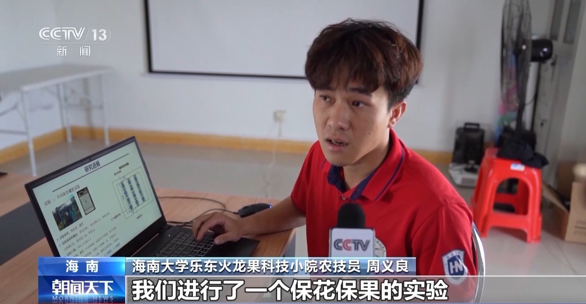 海南大学乐东火龙果科技小院农技员 周义良:根据这个现状,我们进行了一个保花保果的实验,通过不同浓度的硼肥、氨基酸肥、授粉和温度调控来进行实验,坐果率提升了20%左右。