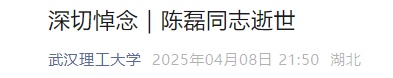 据武汉理工大学消息,中国共产党优秀党员,原武汉工业大学(2000年武汉工业大学、武汉交通科技大学、武汉汽车工业大学合并为武汉理工大学)党委书记、武汉理工大学党委副书记兼纪委书记陈磊同志,于2025年4月8日6时20分在武汉中部战区总医院逝世,享年81岁。