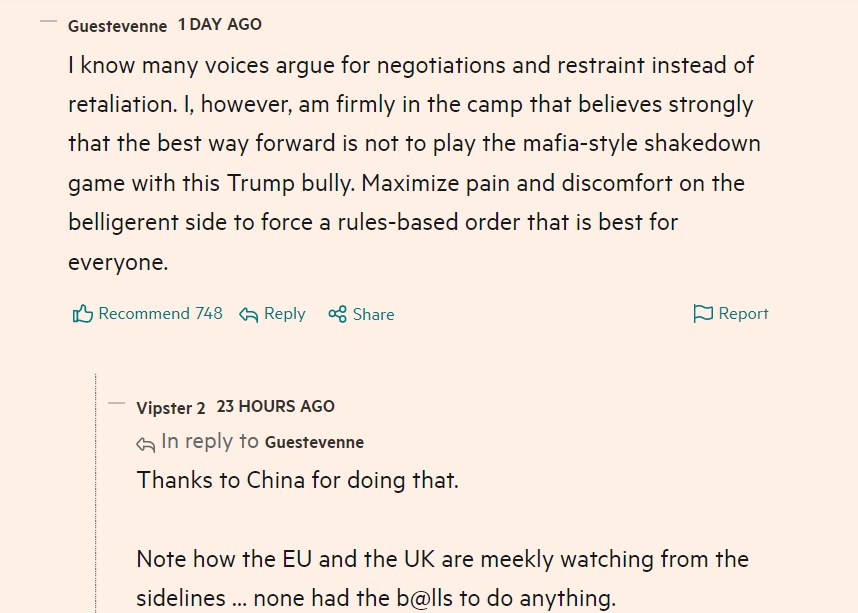 中国的严正立场也引发了同样受到美国关税影响的各国网民对中国的广泛支持。在英国《金融时报》相关报道评论区,获赞最多的一条网友评论称:“我知道有许多声音主张通过谈判和克制来解决问题,而不是采取反制行动。然而,我强烈认为最好的前进方式就是将好战一方的痛苦和不适最大化,如此才能建立一个对所有人都有利的基于规则的秩序。”
