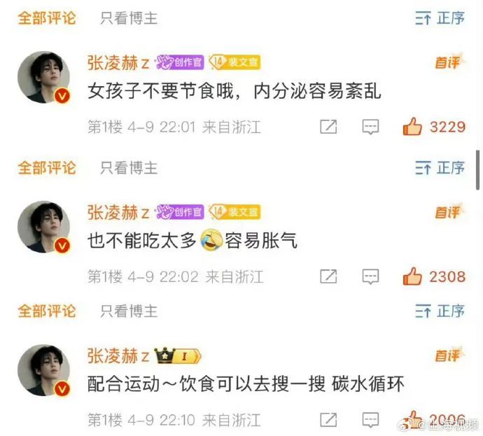 4月9日,演员张凌赫空降超话回复粉丝,有粉丝问饿到患肠胃炎问怎么办?张凌赫回复称,女孩子不要节食,并推荐粉丝尝试碳水循环减肥法。