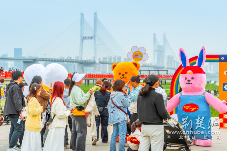 Wiggle熊与顽皮兔打卡“汉口江滩”并与游客互动。通讯员供图