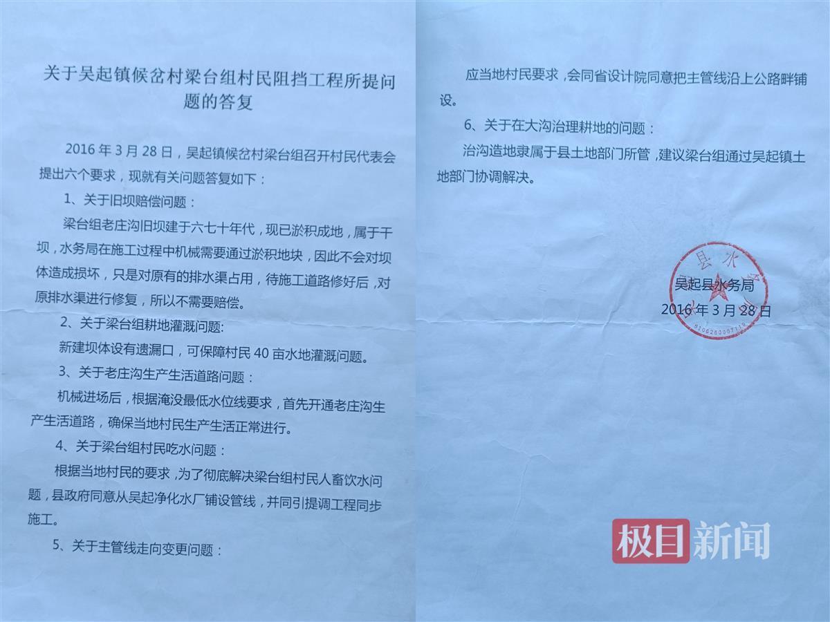 之后,大树梁水库水坝及配套的管理站、蓄水池、泵站、输水管道等相继竣工,上述承诺却被搁置。截至今年3月,吴起县水务局仍未兑现承诺,村民对此意见很大。